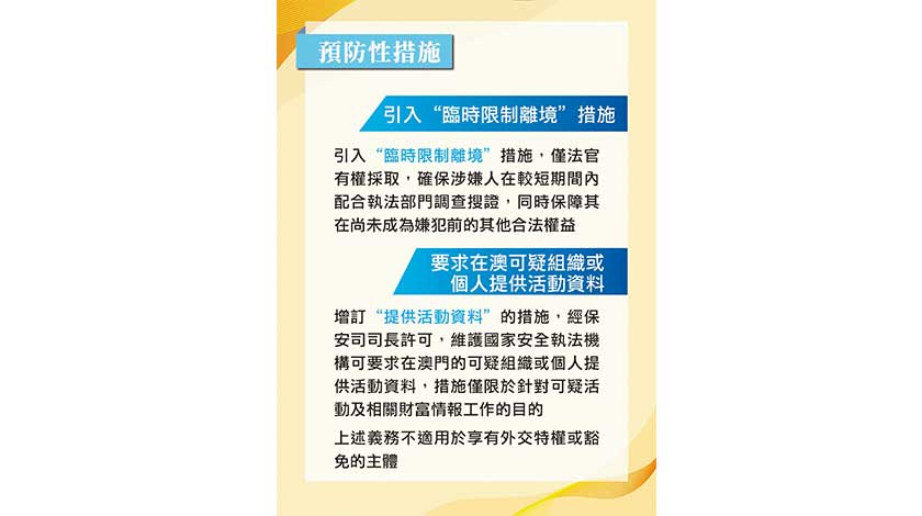 引入「情報通訊截取」措施,執法機構依法可直接向電信商或網絡通訊服務供應商提取通訊紀錄及通訊使用者資料,並受檢察院定期的合法性審查監督。引入「臨時限制離境」措施,確保涉嫌人在較短期間內配合調查搜證。要求在澳可疑組織或個人提供活動資料,僅限於開展針對可疑活動及相關財富情報工作的目的。關於假釋、累犯、羈押和暫緩執行刑罰的特別規定,故意犯罪者不得緩刑,屢犯不得假釋,嫌犯強制羈押。