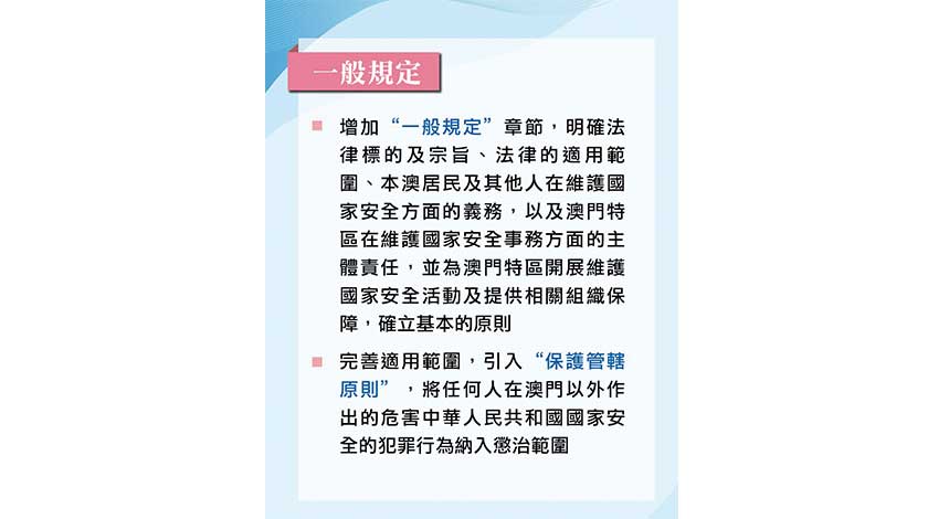 調整犯罪主體界定方面,「政治性組織或團體」改為「組織或團體」,「外國」改為「澳門特別行政區以外」。關於「澳門的政治性組織或團體與外國的政治性組織或團體建立聯繫作出危害國家安全的行為」,制裁透過建立多種聯繫方式作出危害國家安全行為的任何個人、組織或團體。適用範圍方面,引入「保護管轄原則」,將任何人在澳門以外作出的危害國家安全的犯罪行為納入懲治範圍。
