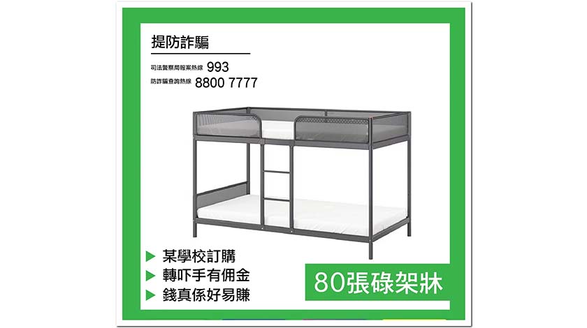 【特訊】司法警察局接獲騙案,騙徒假冒本澳某學校職員,致電傢俱店訛稱需要訂購大量雙層床及床墊,其後,騙徒要求傢俱店向指定的假供應商訂購床墊,更稱傢俱店可從中抽取回佣。事主透過轉帳方式支付訂金後,致電該學校查詢得悉並無訂購一事,並與騙徒及假供應商失去聯絡,隨即報案求助。