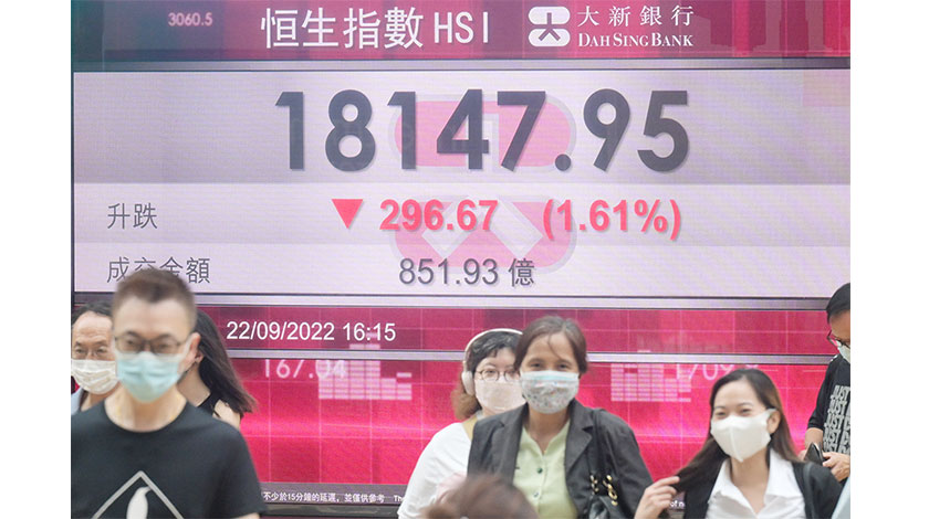 【香港中通社9月22日電】(記者崔靜雯)美聯儲重手加息0.75厘,更預警續打壓通脹,港股再呈跌勢。恆生指數22日收報18147點,跌296點或1.6%,為2011年12月20日後最低收市。全日成交851.93億元。