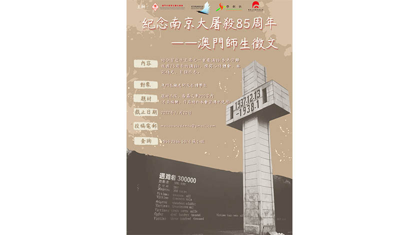 南京大屠殺充分暴露出日本軍國主義者的凶殘,反映出中華民族面臨生死存亡的危急關頭。希望透過是次徵文,讓廣大澳門師生銘記歷史,勿忘國耻,奮發圖強,為實現中華民族偉大復興而努力。投稿時間由即日起至11月20日,題材不限,不設稿酬。