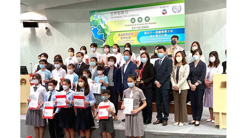 為慶祝世界郵政日,郵電局昨在通訊博物館舉行國際青少年信札徵文比賽頒獎,及畫出郵票故事創作比賽頒獎,局長劉惠明在致辭時稱,從參賽作品中,感受到澳門青少年對社會時事的關心,對生活的熱愛,和對親人朋友的愛護,期望他們繼續創作的動力,進一步提升自己的能力,把握機遇盡展才華。