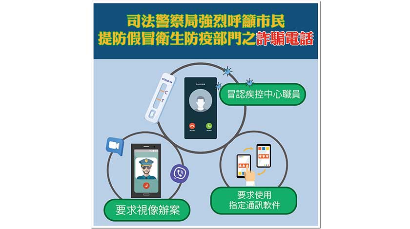 【特訊】近日有市民向司法警察局舉報,指接獲來電顯示為“00”、操普通話、自稱為衛生部門人員的來電,對方聲稱根據事主在內地開立的電話號碼發現其曾與新冠肺炎確診者有共同活動軌跡,需要安排其進行隔離,或指其曾作出涉及疫情的違法行為,並以懷疑其個人資料被盜用為由,將通話轉接至“內地公安”,過程中更要求事主下載手機通訊應用程式進行視頻通話。通話期間,對方訛稱事主牽涉巨額案件,要求提供證件號碼及電話號碼作核對。事主感可疑,隨即掛線並向司警局報案求助。