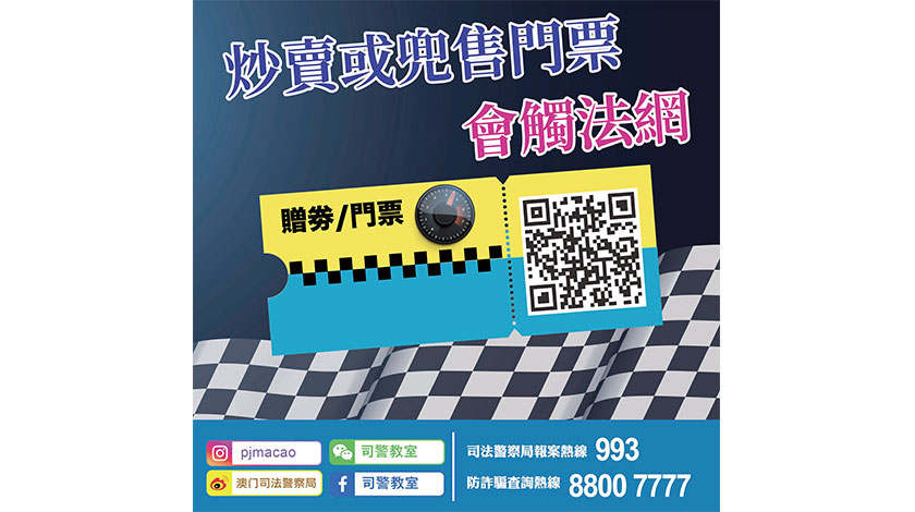 【特訊】近日,司法警察局發現有人於網絡社交平台折價出售第69屆澳門格蘭披治大賽車門票。司警局提醒市民,切勿炒賣或兜售活動門票、贈券,有關行為可能會觸犯法律;同時,市民須警惕網購陷阱,避免購買不明來歷的活動門票,勿讓騙徒有機可乘。
