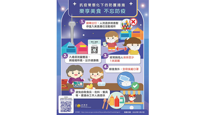 新聞局昨午也發出「樂享美食 不忘防疫」的圖文包,介紹美食節的防護措施:一)人流過多時應暫停進入美食攤位活動場所;二)入場須測量體溫,掃描場所碼,出示健康碼;三)經常與他人保持至少一米距離;四)除進食外,全程佩戴口罩;五)避免自取食品、佐料、餐具等,建議由工作人員提供。
