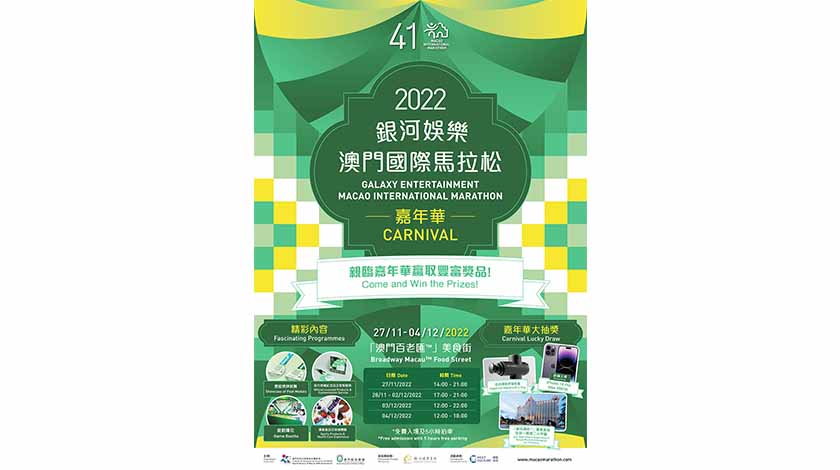 為增加賽事氣氛,由11月27日至12月4日一連八天,將在「澳門百老匯」美食街舉辦「2022銀河娛樂澳門國際馬拉松嘉年華」,活動內容豐富,包括:歷屆獎牌展示、有獎遊戲攤位及大抽獎,亦有不同類型的體育用品展出,包括運動服飾、補充品及醫療保健品等,並設有購物優惠,藉舉辦有關活動營造濃厚的賽事氛圍,而馬拉松嘉年華的開幕儀式將於11月27日下午4時於百老匯舞台1樓舉行,歡迎市民及旅客到場參與。