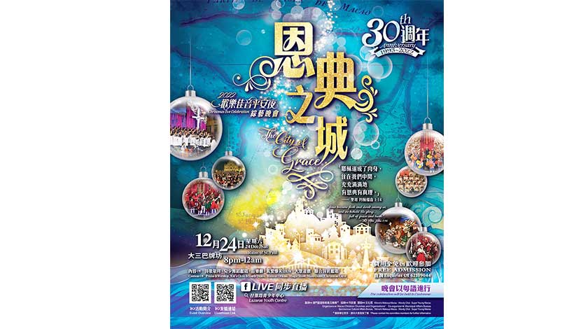 【特訊】12月突來的疫情變化,不減慶祝聖誕節的熱情。由澳門十多個基督教教會及機構聯合舉辦,市政署協辦「2022歡樂佳音平安夜」的綜藝晚會,定於本年12月24日(星期六),平安夜晚上八時至十二時假大三巴牌坊耶穌會廣場舉行。