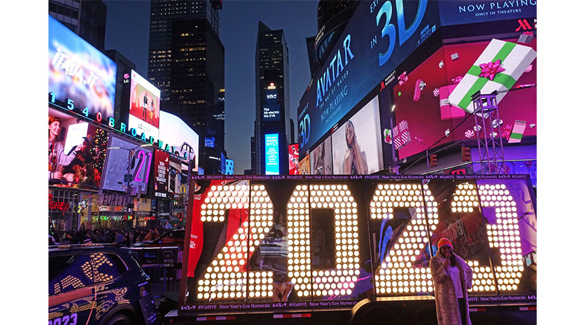 當地時間12月21日,一名女子在紐約時報廣場與巨型數字燈『2023』合影。隨著跨年夜臨近,代表新年的數字燈『2023』日前在時報廣場亮相。 中新社