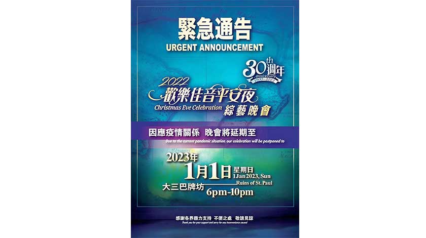【特訊】由澳門十多個基督教教會及機構聯合舉辦,市政署協辦「2022歡樂佳音平安夜」的綜藝晚會,原定於本年十二月廿四日(星期六),平安夜晚上八時至十二時假大三巴牌坊耶穌會廣場舉行。但因應疫情關係,為保障大家的健康,大會經謹慎考慮後,現將晚會延期至2023年1月1日(星期日 )晚上6-10時於大三巴牌坊舉行。