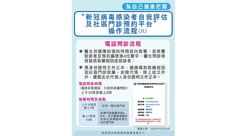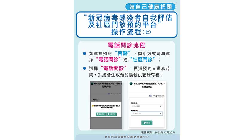 【特訊】新型冠狀病毒感染應變協調中心表示,“新冠病毒感染者自我評估及社區門診預約平台”(下稱自我評估平台)自12 月12日起至今運作暢順,有效發揮分流居民就診和醫院急症室壓力的作用。