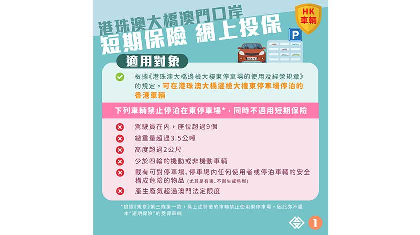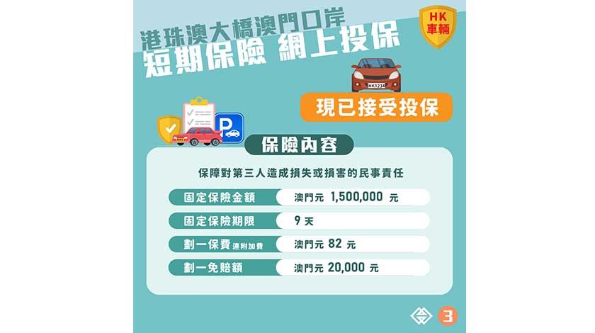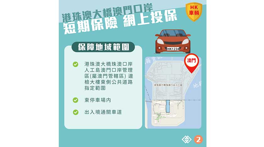 香港車輛根據《港珠澳大橋邊檢大樓東停車場的使用及經營規章》,入出港珠澳大橋珠澳口岸人工島澳門口岸管理區邊檢大樓東側公共道路、停車場,以及出入境通關車道的指定範圍,可透過購買短期保險獲得對第三人造成損失或損害所負的民事責任保險保障。