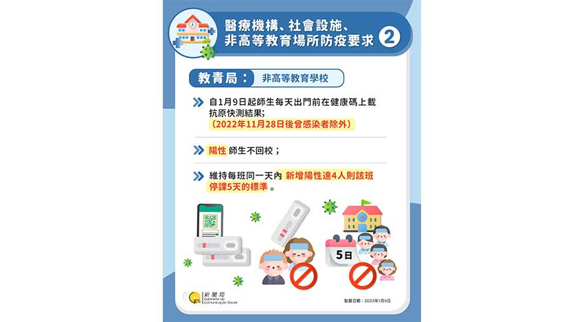 因應非高等教育學生恢復正常的校園群體生活,根據科學數據顯示,近期曾感染新冠病毒的人士在短期內再次感染的機率較低,而未曾感染人士仍有較高的感染及傳播風險,因此,為保障學生的健康,及早發現陽性個案,讓學校作出及時處理,減少疾病在學校內的傳播,同時讓家長可及時因應子女的身體狀況作適切的照顧,經參考鄰近地區的相關實踐經驗,教青局有需要安排未感染的教學人員、職工和學生每天申報抗原測試結果,陽性者不用回校。在復課首日,大部分學校透過落實執行抗原快測的措施,有效發現新感染的陽性師生並作出適切的安排,發揮及早發現和保護師生健康的作用。