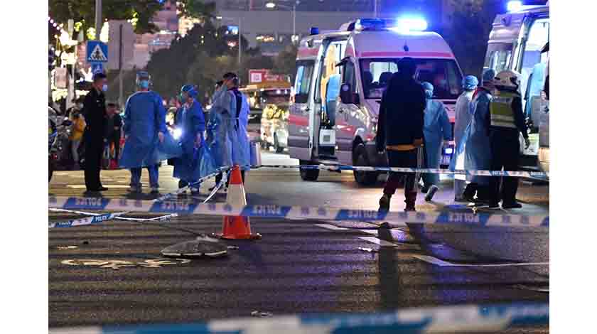 廣州警方11日通報,1月11日17時25分,廣東廣州天河路體育東路口發生一起小車碰撞行人的交通事故,目前造成5死13傷。接報警後,廣州交警迅速派員趕赴現場處置,並協助醫務人員救治傷者。目前,涉事司機溫某(男,22歲,廣東揭陽人)已被警方控制,事故正在進一步調查處理中。圖為警方和醫護人員在處理交通事故現場。 中新社