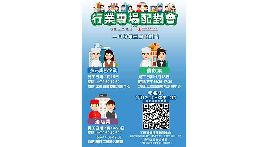 勞工局和工聯會透過短訊通知欲尋找相關工作的求職者,凡收到短訊的求職者或有意參加配對會的澳門居民,可由1月12日至17日中午12時,登入勞工局行業專場配對會專頁(https://www.dsal.gov.mo/zh_tw/standard/indjobfair.html)報名,名額有限,額滿即止。