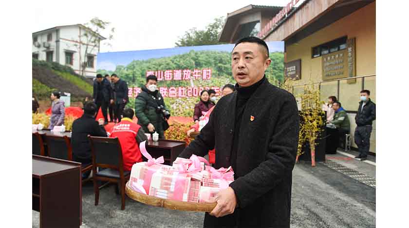 1月12日,重慶南岸放牛村的工作人員正在準備發放分紅款。當日,重慶市南岸區南山街道放牛村股份經濟合作聯合社2022年分紅大會在此間舉行,符合條件的1150位“股民”共獲得262萬元人民幣分紅。放牛村是重慶市農村“三變”改革試點村。2019年,放牛村對集體土地、林地、水域等物質性資源,民俗、古樹等人文資源及已有集體經營性資產進行清產核資,並將經營性資產全部折價入股,成立放牛村股份經濟合作聯合社,讓村民變股民。 中新社