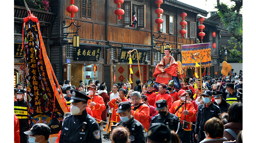 1月26日,福州三坊七巷天后宮舉行『迎財神』民俗巡遊活動,吸引許多市民和遊客駐足觀看。當日是農曆正月初五,中國民間有『迎財神』的習俗。 中新社