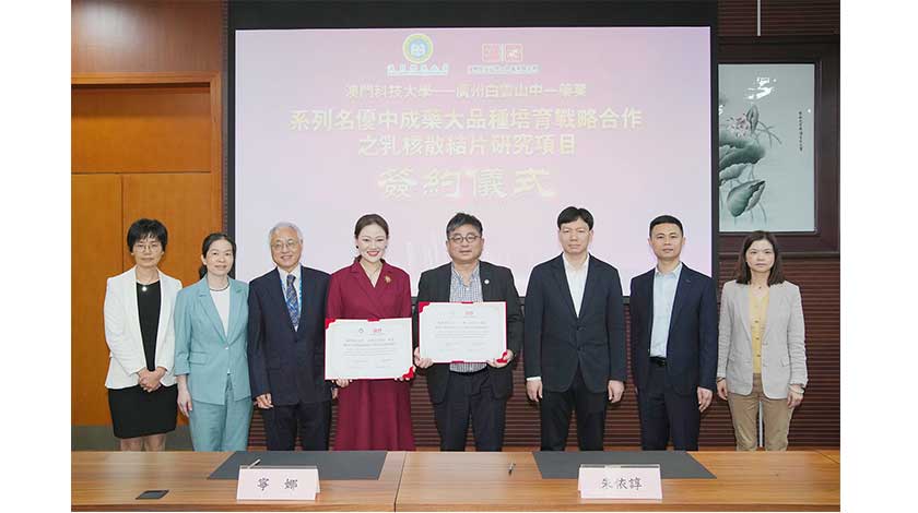 《乳核散結片對乳癖模型大鼠體內藥效及機制研究》技術服務合同簽署儀式在澳門科技大學舉行,由澳門科技大學協理副校長、藥學院院長朱依諄與廣州白雲山中一藥業、奇星藥業總經理寧娜簽署。
