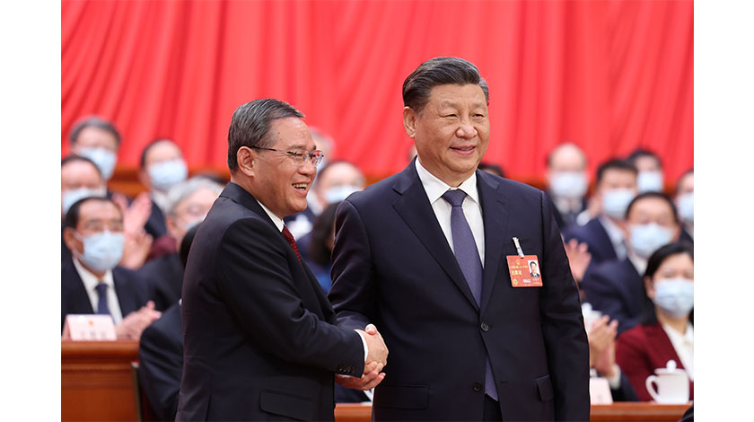 3月11日,十四屆全國人大一次會議在北京人民大會堂舉行第四次全體會議,根據國家主席習近平的提名,經過投票表決,決定李強為中華人民共和國國務院總理。圖為習近平同李強握手。 中新社