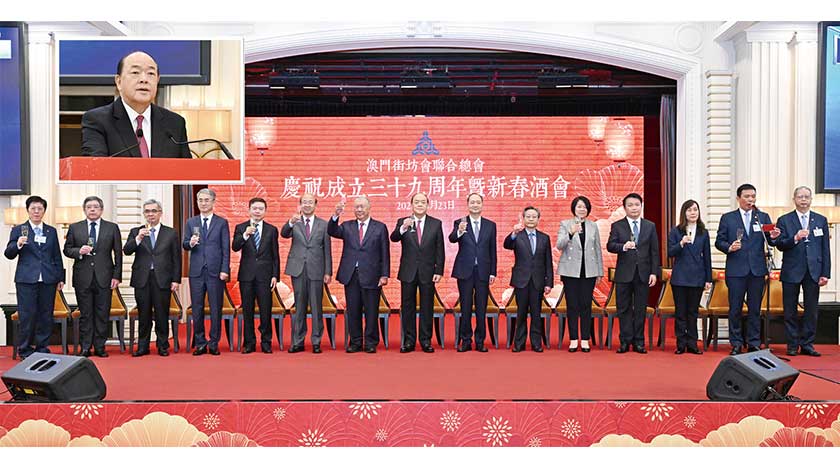 【本報訊】街總昨辦慶祝成立三十九周年暨新春酒會,官蓋雲集。特首賀一誠致辭稱,本澳逐步復常,政府各項發展任務更為迫切,新形勢亦對施政工作提出更高要求,他們會奮發有為,努力破解經濟社會發展中的深層次矛盾和問題。又強調政府會續支持街總發展,更好為居民辦實事、謀福祉。
