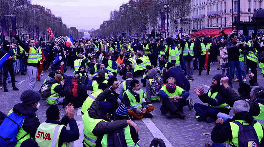 當地時間12月8日,巴黎發生新一輪大規模示威。這是巴黎連續第三個周六發生大規模示威。圖為示威者在香榭麗舍大街聚集。(中新社圖片/ 李洋 攝)