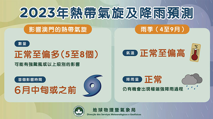 【本報訊】氣象局預測今年風季偏早來臨,全年約有五至八個熱帶氣旋影響本澳,屬於正常至偏多;另預測今年雨季累積降雨量正常,唯仍可能出現極端強降雨。