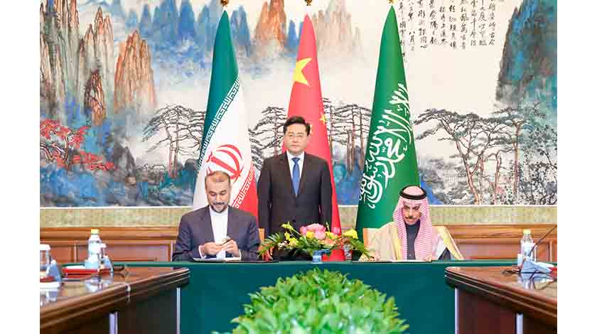 4月6日,國務委員兼外長秦剛在北京集體會見來華舉行沙伊外長會晤的沙特外交大臣費薩爾、伊朗外長阿卜杜拉希揚。會晤後,秦剛見證沙伊雙方簽署聯合聲明,兩國宣佈即日起恢復外交關係。 新華社