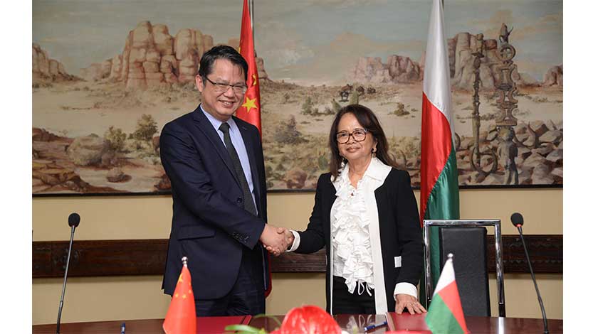 4月6日,中國駐馬達加斯加大使館臨時代辦張偉(左)與馬達加斯加外交部長伊薇特·西拉在塔那那利佛的框架協議簽署現場握手。中國和馬達加斯加6日在塔那那利佛簽署一份框架協議。根據協議,中方將向馬方提供優惠貸款,幫助馬方建設位於塔那那利佛市西北部的拉努馬法納水電站,保障馬首都地區電力供應穩定。(新華社)