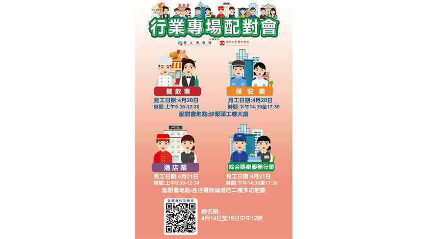 上述餐飲業配對會、保安業配對會在澳門工會聯合總會(沙梨頭海邊街2-6號工聯大廈)舉行;酒店業配對會及綜合娛樂服務行業配對會在氹仔羅斯福酒店二樓多功能廳舉行,報名日期由4月14日起至4月19日中午12時。