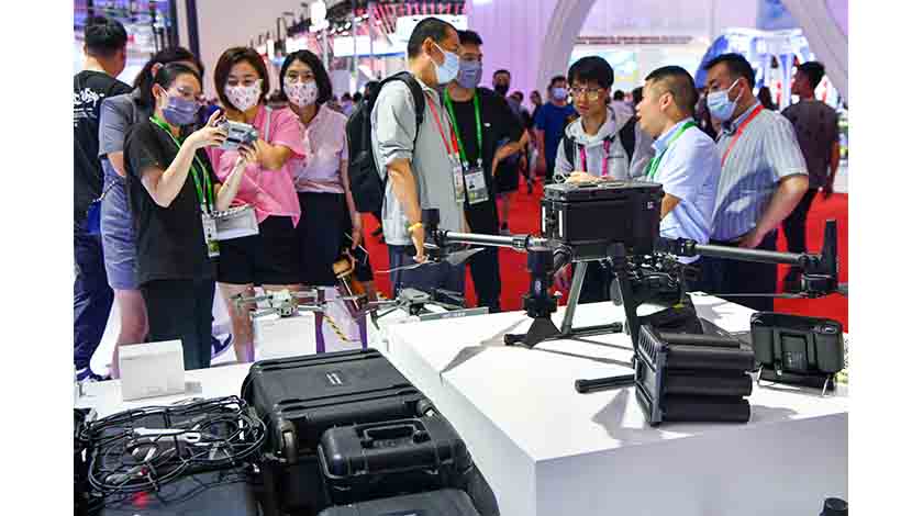 4月13日,第三屆中國國際消費品博覽會正在海南海口舉行。在廣東展館,多款無人機吸引參觀者。 中新社
