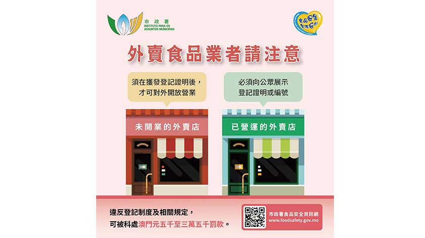 市政署再次提醒業界,在開設外賣店前必須向市政署提出登記申請,並在獲發登記證明後,才可向公眾開放營業。同時,須向公眾展示登記資料,實體店須於當眼處張貼登記證明;若是透過互聯網或手機應用程式作為經營或推廣途徑,須於上述媒介界面上顯示場所登記編號;網路第三方食品交易平台(如外賣APP)亦有責任確保進駐平台的所有外賣店已完成登記,並將其登記編號等資料顯示於平台上,以便消費者辨識。一旦違反登記制度,可被罰款澳門元五千至三萬五千元。