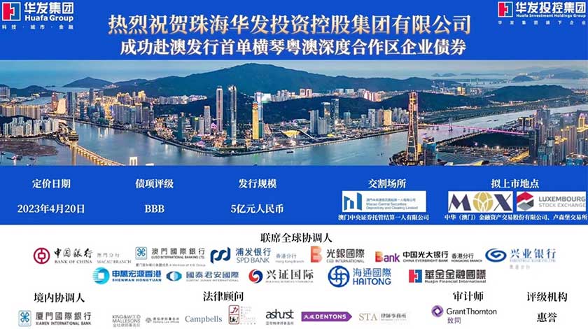 【特訊】2023年4月20日,澳門國際銀行助力珠海華發集團有限公司(以下簡稱“珠海華發”)成功在澳門發行5億人民幣高級無抵押擔保債券,該債券成爲首筆落地的“橫琴粵澳深度合作區”債券(“深合債”),亦是澳門債券市場首筆以人民幣計價的非金融類企業債券,首筆利用中、英、葡三語作債券條款宣示及宣讀的澳門債券。債券將在澳門中央證券托管系統登記托管交割、在中華(澳門)金融資産交易股份有限公司及盧森堡交易所同步上市。