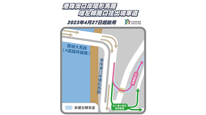 【特訊】為優化道路交通規劃,配合市民的出行交通需要,交通事務局正於港珠澳及青茂口岸周邊開展道路改善工程。當中,為優化進出港珠澳大橋口岸人工島道路的通行條件,港珠澳口岸環形馬路左側車道旁綠化帶位置開闢出一個左轉路口(詳見附圖),供車輛可直接駛往出境車道,相關路口昨日啟用。另外,豚城大馬路將於公共建設局完成路面擴寬工程後改為雙向四線行車、豚城大馬路往港珠澳口岸環形馬路的右轉路段改為雙線行車、馬萬祺博士大馬路往濠江圓形地方向約120米道路改為雙線車道,以提升進入口岸的車道通行能力,減少出境車輛等候通關而做成的擁塞情況。相關改善工程視天氣狀況,預期於4月28日(周五)完成工程後陸續投入使用。