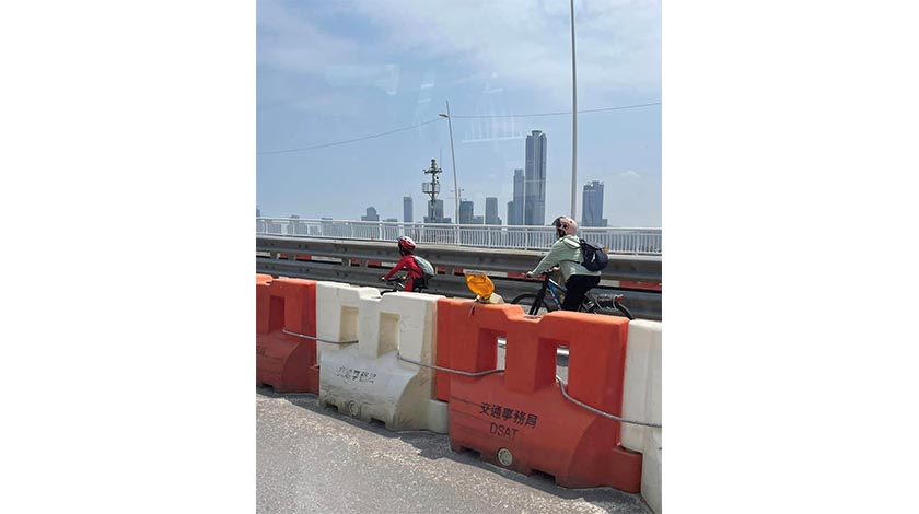 事發於昨日中午一時許,五名人士各自踩一部單車,大搖大擺經西灣大橋電單車專道過橋,有目擊者拍下過程網上分享,引發熱論。從網上分享的相片所見,各人都戴上頭盔和孭起背囊,一女子單手駕車,另一手舉起手機似在拍攝前方同行者。