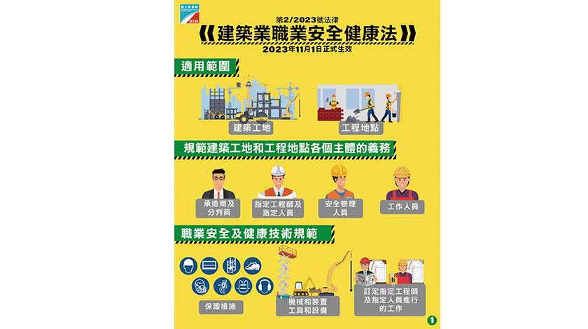 為配合建築業發展及保障從業員的職業安全健康,特區政府制訂第2/2023號法律《建築業職業安全健康法》,明確規範建築工地或工程地點各主體就職業安全健康方面應負的義務、訂定保障施工安全的措施、規範安全管理人員的設置及其准照制度,以及規定由補充法規訂定相關的建築業職業安全健康技術規範。