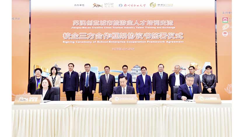 活動上,美高梅亦與揚州市職業大學及揚州揚子江投資發展集團簽署校企三方合作框架協議,內容包括開展職業培訓、技能等級評核、研究制定創新人才培養方案、研發教材產品、為學生提供企業參訪、實習和就業機會,以及定期開展揚澳兩地文化美食交流活動等。三方將充分發揮協同優勢,開啟全程全面的深度合作模式,在各方面加強共建共用共通,為區域旅遊業高品質發展培育更多高素質技能人才,為蘇澳旅遊業的合作交流添磚加瓦。