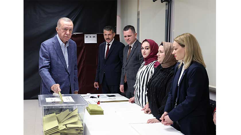 土耳其舉行總統和議會選舉 5月14日,在土耳其伊斯坦布爾,現任總統埃爾多安(左一)在一處投票站投票。 土耳其總統和議會選舉投票當地時間14日8時(北京時間13時)開始舉行,現任總統埃爾多安等3名候選人角逐總統職位,24個政黨和151位獨立候選人爭奪大國民議會600個議席。(新華社)