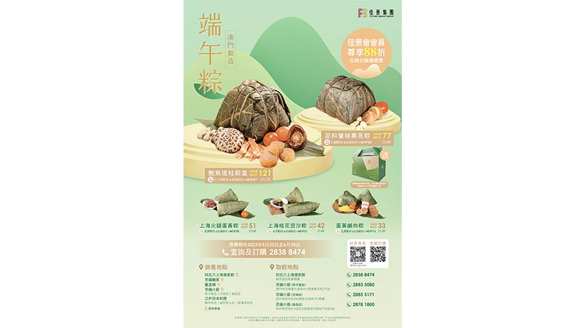 佳景粽品除可在指定門市購買外,亦可於6月18日前登入佳景集團官方商城選購,商城網址: https://www.futurebrightgroup.com/tc/pre_order.php。查詢熱線:(853)2838 8474。