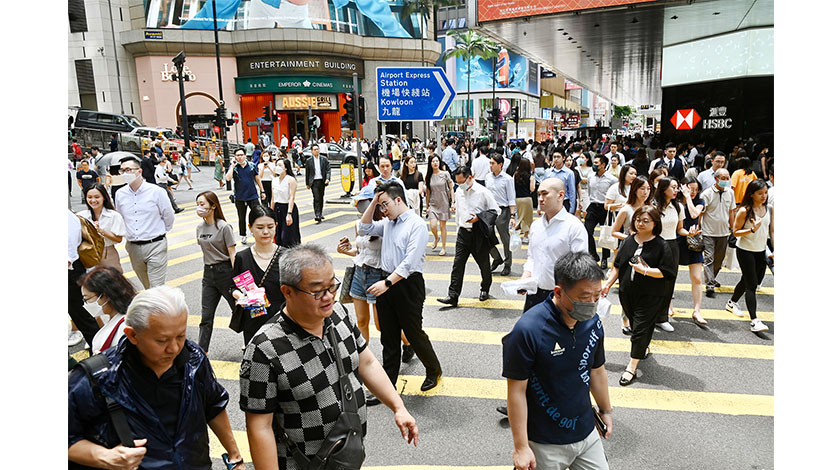 【圖片新聞】 6月8日,香港一網上求職招聘平台公佈《2023年薪酬調查報告》結果顯示,香港僱員薪酬增幅連升3年,平均薪金加幅達4.1%,受訪僱員對香港就業前景轉趨樂觀,83%持中性至樂觀看法,較去年增長23%。圖為香港大批上班族於午休時間外出。(中新社)