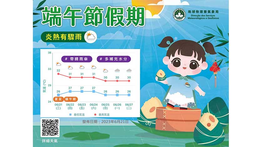 氣象局又指,地面氣溫預報圖顯示,未來數日廣東沿岸日間最高氣溫可達32至34度,本澳日間部份地區亦有機會達至酷熱。但受西南季風的影響,會偶有幾陣驟雨稍助消暑降溫。市民外出活動時,記得帶備雨傘,以及多補充水分。