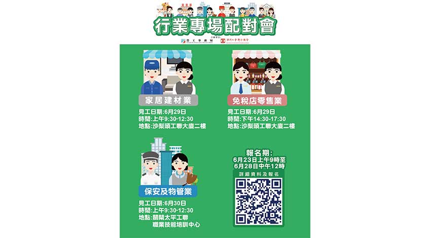 上述家居建材業配對會及零售業配對會在澳門工會聯合總會(沙梨頭海邊街2-6號工聯大廈)舉行,保安及物管業配對會在澳門工聯職業技能培訓中心(關閘馬路101-105A號太平工業大廈第一期1樓)舉行,報名日期為6月23日上午9時至6月28日中午12時。