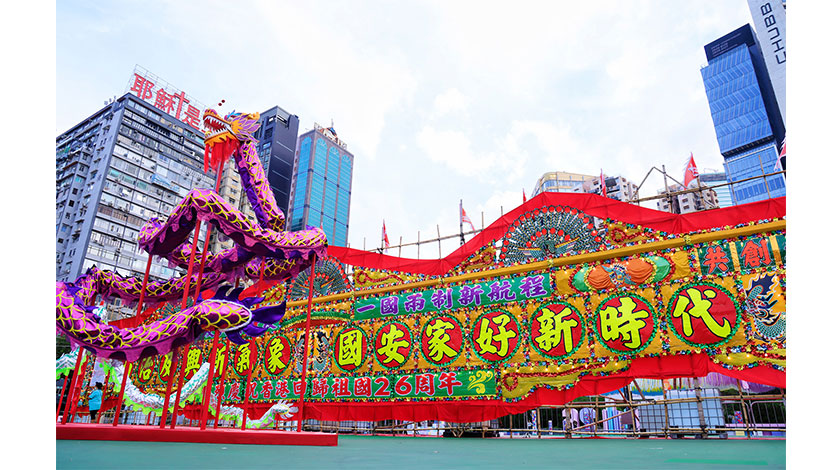 【香港中通社6月30日電】(陳偉根)6月30日,香港各界慶典委員會於維多利亞公園舉辦慶香港回歸祖國26周年活動。華麗搶眼的唐紋華服、精彩紛呈的東明舞獅、花團錦簇的大型紙紮花牌吸引了大批市民。