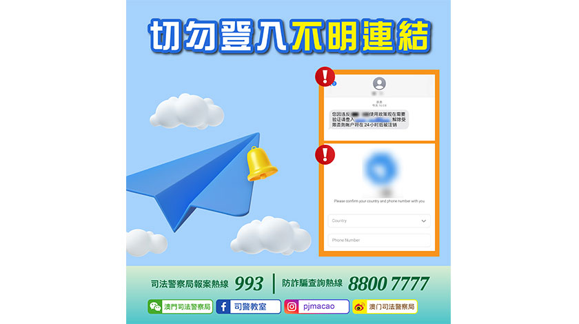 【特訊】近日,司法警察局發現有不法分子向市民隨機發送附有不明連結之短訊,內容為訛稱市民的手機通訊軟件帳戶因違反使用政策而受限制,誘騙市民點擊短訊內的連結以進入一個與官方網站內容及版面極為相似之釣魚網站,企圖令市民輸入帳戶號碼及驗證碼等資料,藉此盜取相關通訊軟件的帳號使用權。
