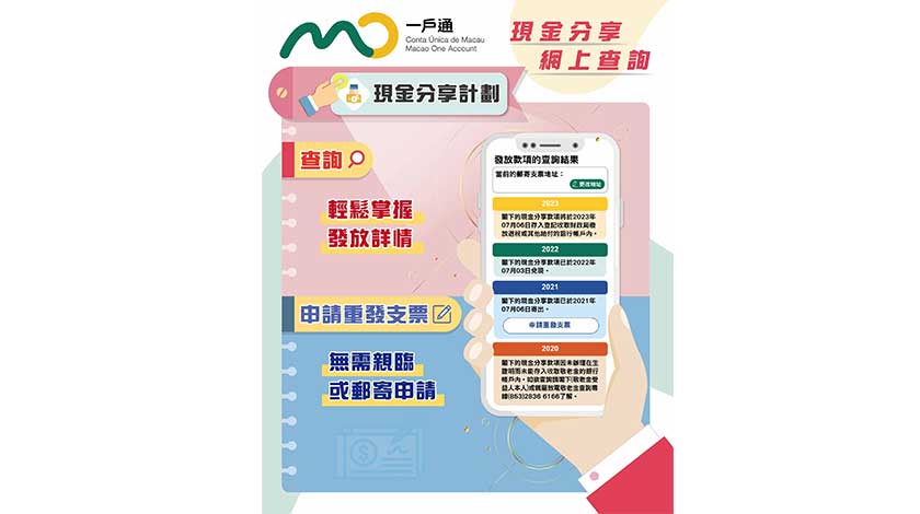 澳門居民只需登入其“一戶通”帳戶,於服務頁面選擇“現金分享計劃”,便可立即查詢現金分享款項發放狀況、未能符合法律規定發放條件的原因,以及當前的郵寄支票地址。如需更改地址或申請重發支票,亦可透過“一戶通”即時辦妥,方便居民無需親身前往部門或郵寄提交申請,隨時隨地線上辦理,省時便捷。