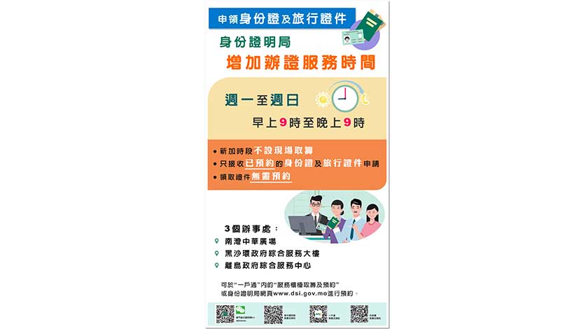由於暑期市民外遊增多,申請辦理特區護照等服務需求仍然不斷增加,預約輪候的時間相對較長。為快速回應市民的辦證需求,身份證明局參照早前增加服務時間的經驗,將市政署和行政公職局臨時借調人員,增加至合共100名,以便從今日起南灣中華廣場、黑沙環政府綜合服務大樓,以及離島政府綜合服務中心三個辦事處,每天的服務時間將延長至晚上9時,星期六、星期天正常辦公,為市民提供一週7天、每天朝9至晚9的無間斷辦證服務。