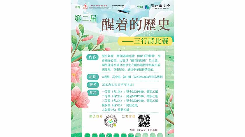 【特訊】由澳門學聯編輯委員會主辦、澳門基金會資助的第二屆“醒着的歷史”——三行詩比賽正接受報名參賽。是次三行詩創作比賽期望能讓全澳學生在創作過程中展現出中華歷史文化的獨特風采,成為一名能講好中國故事、講好澳門故事的有為青年。