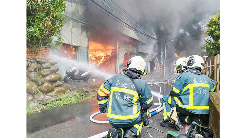 【圖片新聞】7月9日上午11時許,台北市北投區承德路七段一間鐵皮工廠發生火警,存放雕刻機具的工廠不明原因起火,現場火勢猛烈,有持續往旁邊建物延燒的情形,消防人員獲報到場佈線搶救中,暫時無人受困,詳細事發原因仍有待撲滅後調查釐清。(香港中通社)