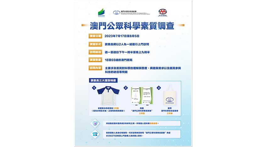 【特訊】為落實《澳門特別行政區政府與中國科學技術協會合作框架協議》中,有關“加強科技普及,促進澳門居民科學素質提升”的合作內容,教育及青年發展局聯同澳門科學技術協進會、中國科學技術協會與中國科普研究所於2023年7月17日至8月5日期間開展“澳門公眾科學素質調查”,調查對象為18至69歲的澳門居民,以掌握澳門居民獲取科技資訊和參與科普活動的情況,深入了解澳門居民對科普的需求和對科學技術的看法與態度,為日後制定科普教育政策和措施提供依據。