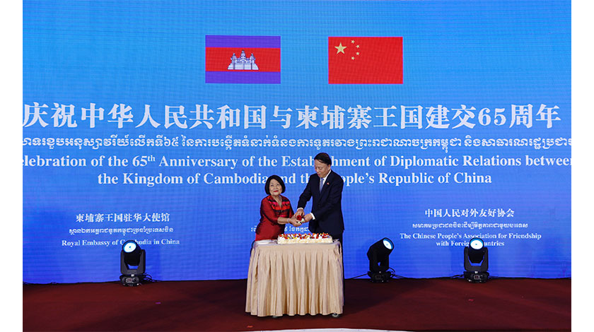 7月19日,中國人民對外友好協會與柬埔寨駐華大使館在北京共同舉辦慶祝中柬建交65周年招待會。全國人大常委會副委員長武維華與柬駐華大使凱·西索達出席招待會並致辭。圖為切蛋糕環節。 中新社