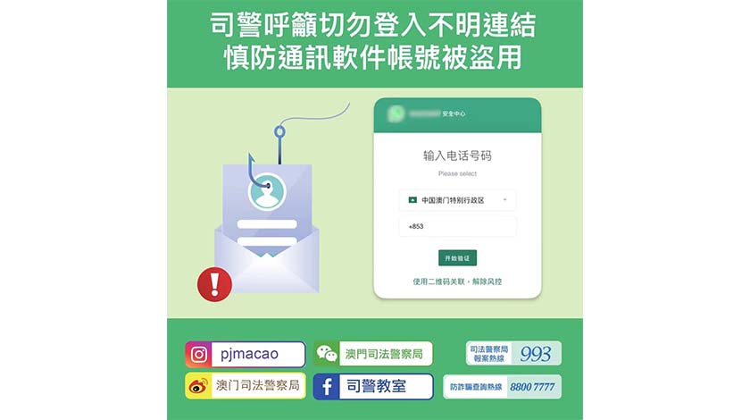 鑒於近年不法份子透過上述手段盜取市民通訊軟件帳號後,再向該帳號內的”好友”進行詐騙,部分案件更造成財產損失。為此,司警局呼籲市民,切勿點擊來歷不明的短訊連結,應循官方渠道確認短訊內容的真實性,以及小心核對連結及網頁上顯示的相關資料是否正確,切勿輕易提供個人或驗證碼等資料。如懷疑遭到詐騙,應立即致電司警局防詐騙查詢熱線8800 7777或報案熱線993求助。