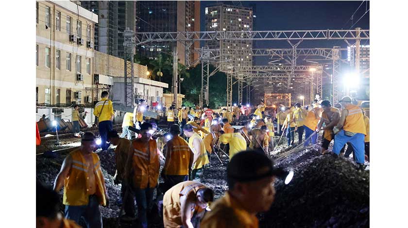 【圖片新聞】7月21日淩晨,廣東省深圳市,廣鐵集團廣州工務段江村綜合維修車間組織146名施工人員對廣深線深圳站3號道岔進行整體更換。在兩台挖機的配合下,經過工作人員4個小時施工作業,一組37.9米長的道岔被整體換上線路,施工作業順利完成(中新社)